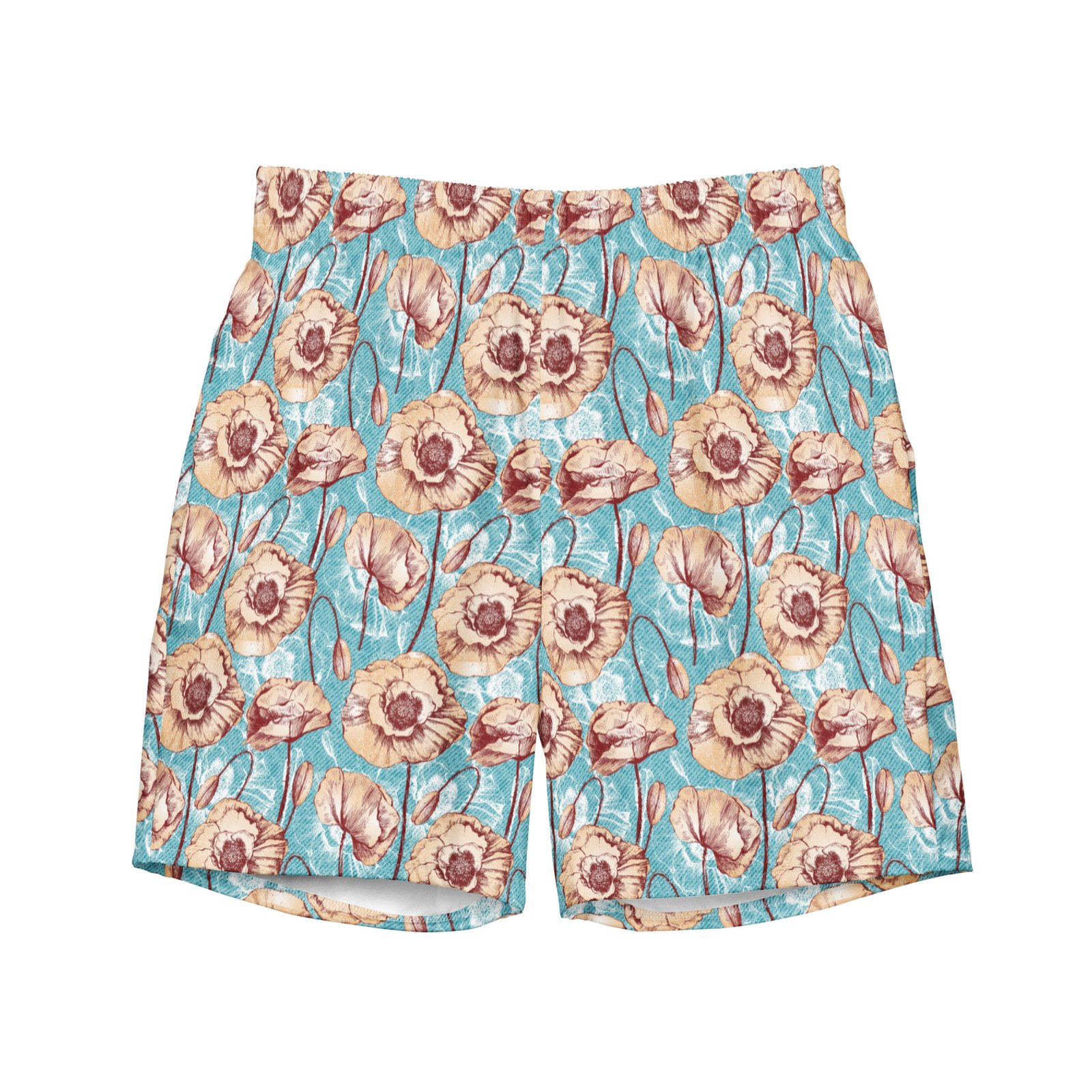 Mens Floral Swim Trunks: Light Blue & Brown Artistic Design