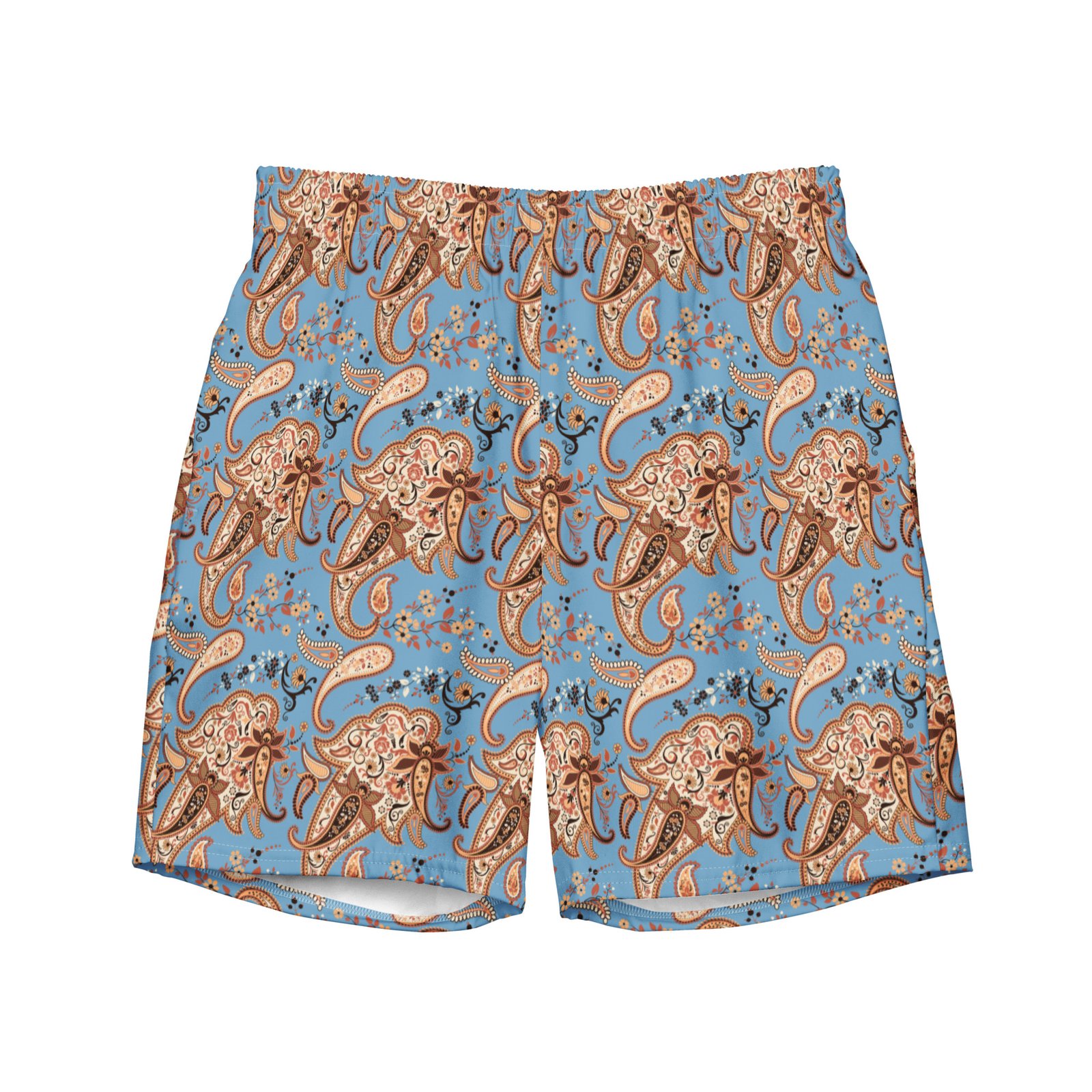 Mens Light Blue Swim Trunks: Beige Paisley Quick Dry Beachwear